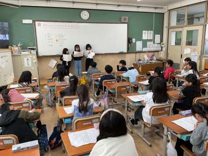 今日は、町たんけんでインタビューしたことや発見したことをクラスのみんなに発表しました。