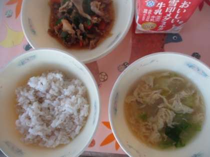 今日の献立は、◆むぎごはん ◆テジプルコギ ◆レタスとたまごスープ ◆牛乳 です。