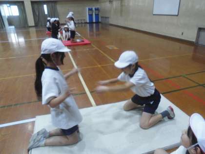 腕相撲、膝立ち相撲、けんけん相撲、押し合い相撲など色々な相撲をしました。人を押す、引く動きや力比べをする運動を楽しみながら活動することができました。