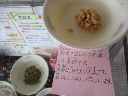 「まめじゃこごはんのぐ」は、新しい献立です。ごはんに混ぜて食べる具で、ひきわり大豆・だいこん葉・じゃこが入っています。ひきわり大豆は、大豆を細かく砕いたもので、ごはんに混ぜやすく、食べやすいのが特徴です。