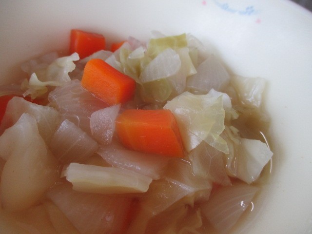 「やさいのスープに」は、にんじんやキャベツなどの野菜がたっぷり入っています。今日みたいな寒い日には体が温まる一杯です。