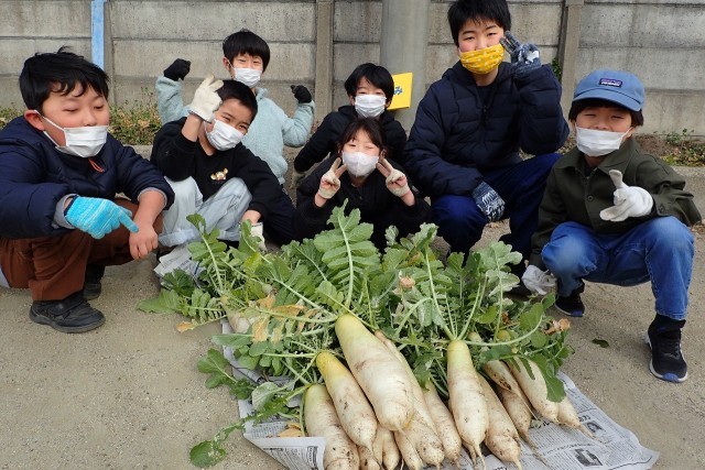 秋に植えた大根をみんなで抜きました。土の中から顔を出した大根は、どれも太くて立派で、想像以上の大きさに思わず歓声が上がりました。友だちと比べたり、重さを感じたりしながら、育てる楽しさと収穫の喜びを実感することができました。