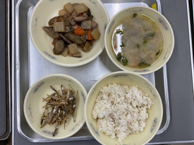 ◆麦ごはん ◆煮しめ ◆ごまめ ◆京風みそ汁 ◆牛乳 です。