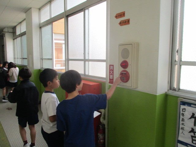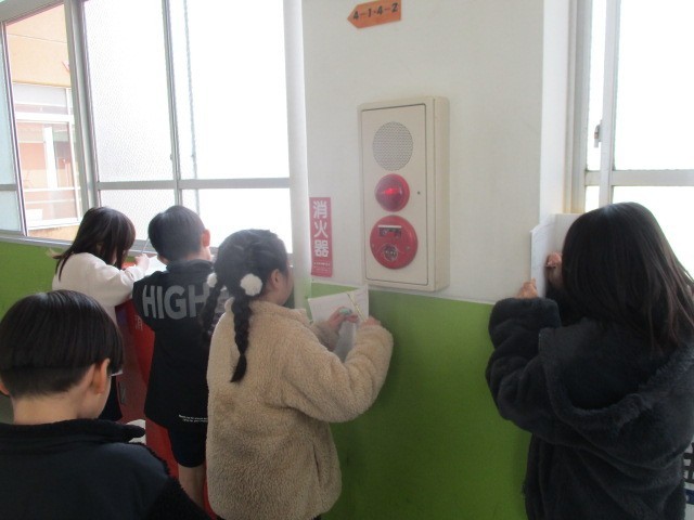 社会科「火事をふせぐ」の学習で、学校にある火事のそなえを探しに行きました。