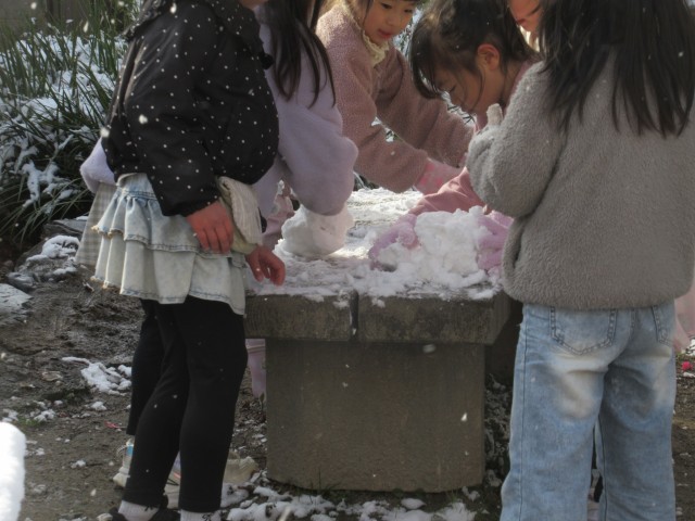 いろいろなところから雪を集めて、大きな雪玉を作っている子、手がたをつけて楽しんでいる子。