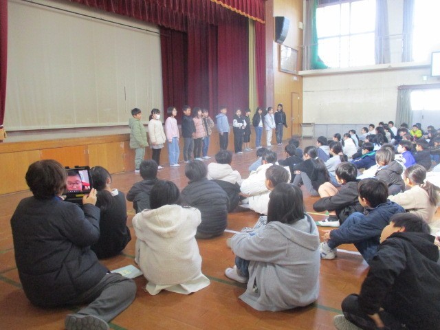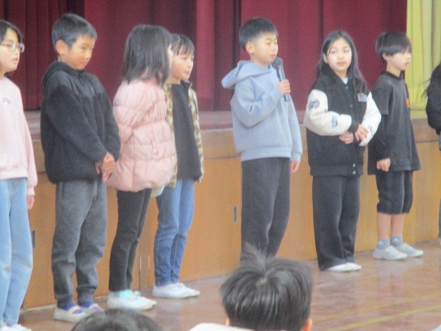 児童朝会で、代表の12人が発表しました。