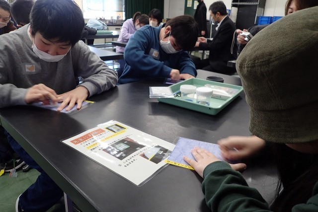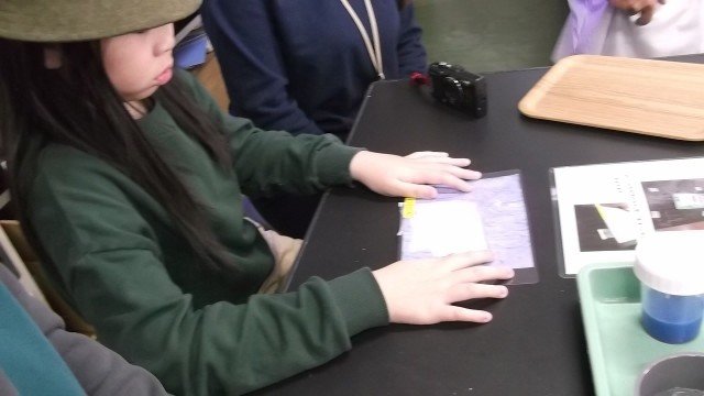 高学年は、サーモインクを浸した布に、カイロを当てると色が変わる実験に取り組みました。