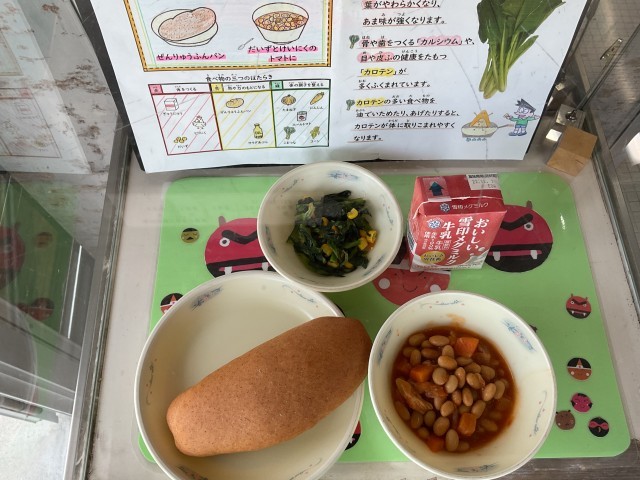 ◆ぜんりゅうふんパン ◆だいずとけいにくのトマトに ◆こまつなのソテー ◆牛乳 です。
