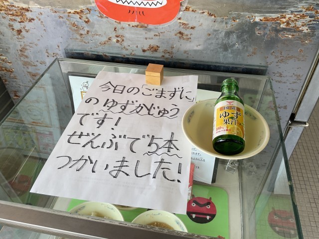 「ごまずに」は、ごまの香ばしさがふわっと広がる副菜です。冬においしいほうれんそうなどの葉物野菜は、寒さに当たることで葉がやわらかくなり、甘みが強くなります。すりごまの風味が野菜にほどよくからみます。今日のごまずににはゆず果汁が使われています。今日の食育だよりでも「ゆず」が紹介されています。ゆずは、さわやかな香りとやさしい酸味が特徴の冬の果物です。皮の部分には香りのもとがたっぷりふくまれていて、料理に少し加えるだけで味わいがぐっと豊かになります。ビタミンCも多く、寒い季節の健康に役立つ食材です。