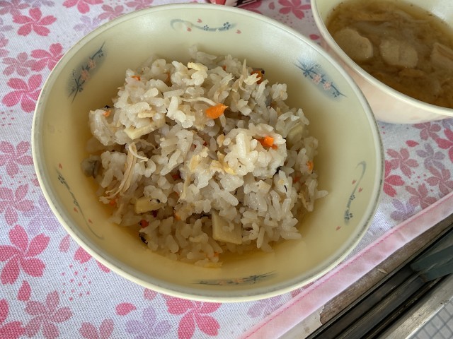 「とりごぼうごはん」は、鶏肉とごぼうのうま味がごはんにしっかりしみ込んだ炊き込みごはんです。アルファ化米を使って大きな釜で煮込みました。ごぼうの香りとシャキッとした食感がアクセントになり、噛むほどに味わいが広がります。鶏肉のコクとだしの風味が合わさって美味しくいただきました。