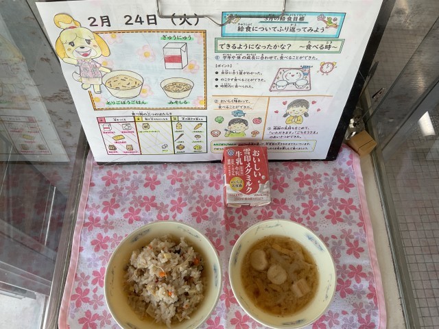 今日の献立は、◆とりごぼうごはん ◆みそしる ◆牛乳 です。