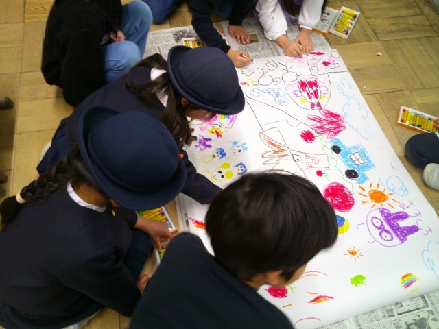 一緒に絵を描いたり、学校での過ごし方を教えたりして、教室の中はとてもにぎやかで楽しそうな