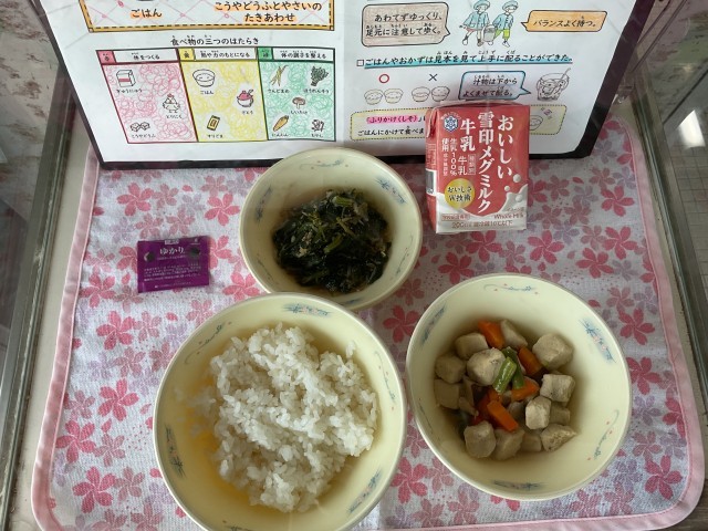 ◆ごはん ◆ふりかけ(しそ) ◆こうやどうふとやさいのたきあわせ ◆ほうれんそうともやしのごまに ◆牛乳 です。