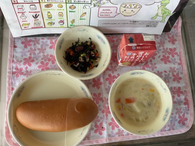 ◆こくとうコッペパン ◆ひじきのソテー ◆コーンのクリームシチュー ◆牛乳 です。