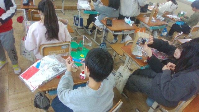 5年生の図画工作科の学習では、ミラクルミラーワールドの学習をしています。鏡までの距離を変えることで、見える数や形が変わることや、正面からでは見えない裏側に、反射することで見えるものを作るなど、鏡の反射をいかしておもいおもいの作品を作っています。