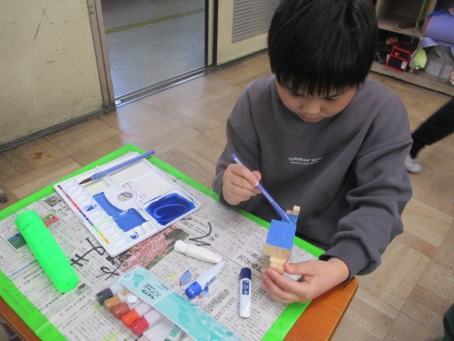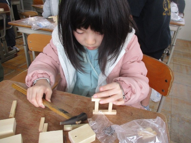 図画工作科では、金づちでくぎうちにチャレンジ。