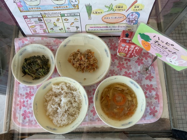 ◆むぎごはん ◆こまつなのごまあえ ◆おからツナどんぶりのぐ ◆いものこじる ◆牛乳 です。