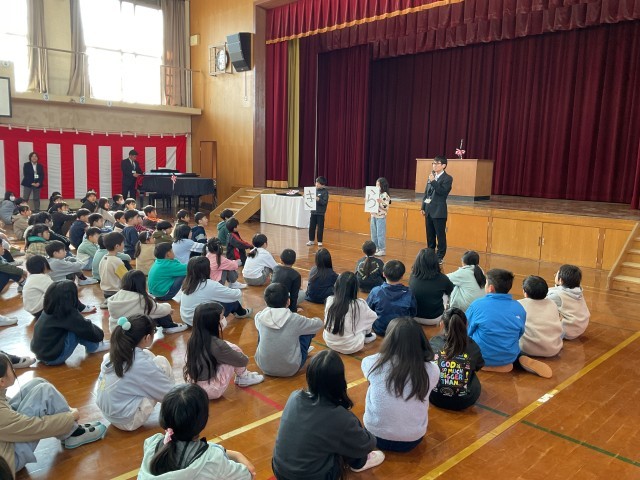 続いて、春休みの過ごし方について担当の先生からお話がありました。「規則正しい生活を続けること」「来年度の準備をしっかりしておくこと」。新しい学年を気持ちよく迎えるために大切なことを、子どもたちは真剣な表情で聞いていました。