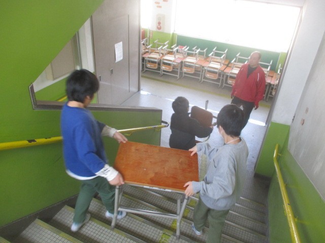 離任式のあとは、5年生が教室の机や椅子の移動を手伝ってくれました。4月から教室の場所が変わるため、それぞれの教室にある机と椅子を新しい教室へ運びます。声を掛け合いながら、てきぱきと動く姿がとても印象的でした。