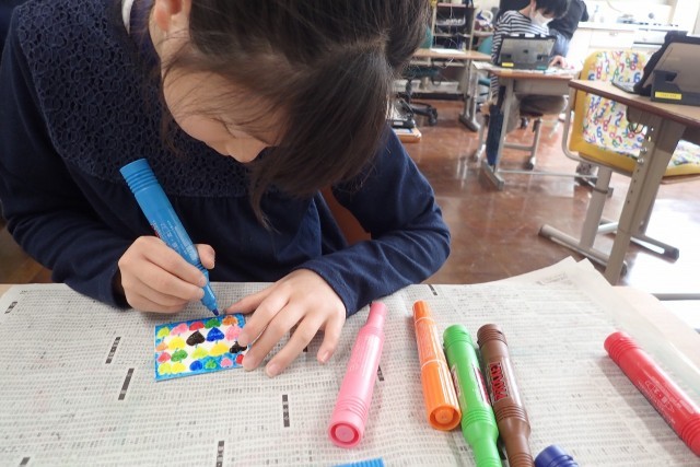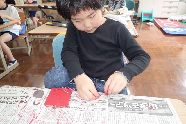 図工の時間に、ブンブンゴマを作成しました。