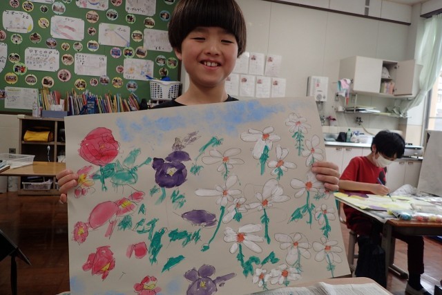 図工の時間に、春の花の絵を描きました。