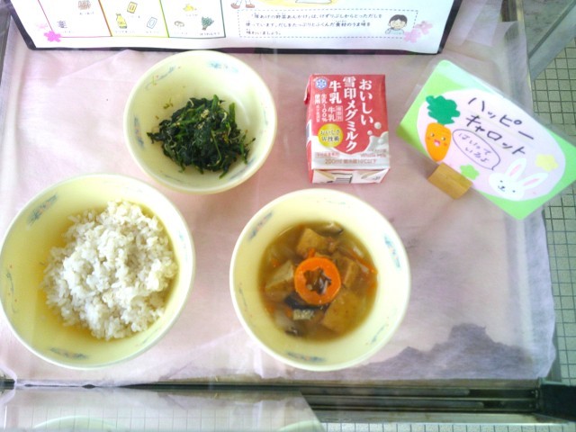 また、今日は給食調理員さんが型抜きしてくださった「ハッピーキャロット」が入っていました。