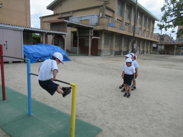はじめに、鉄棒の持ち方を確認。その後は、これまでの経験を生かして、難しい技にも挑戦している子がたくさんいました。