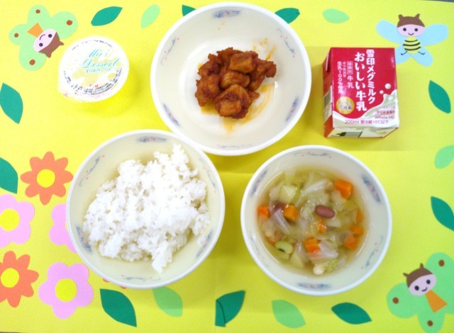 今日の給食は、行事献立 子どもの日と新しい献立のバッファローチキンが登場しました。