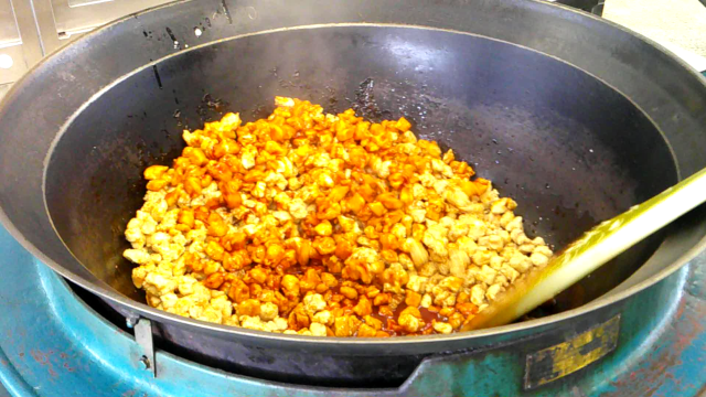 揚げた鶏肉を、トマトケチャップや酢などからできたのソースをからめて完成です。