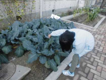 9月に植えたブロッコリーは,朝晩の寒さや台風に負けることなく,すくすく成長しています。放課後には,葉に虫がついていないかを見て,とっている子もいます。