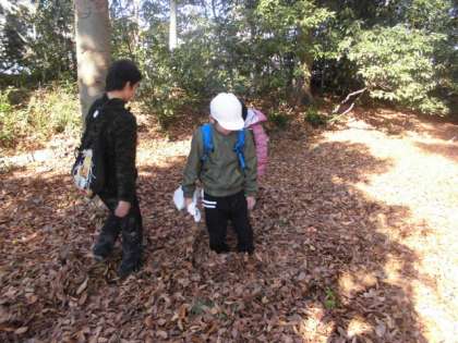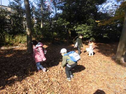 七条エリアの育成学級のお友達といっしょに御所で秋見つけをしました。御所ではたくさんの落ち葉があり,ふかふかの落ち葉で遊びました。「落ち葉のシャワー。」「わー足がこんなにうまったよ。」と,とても楽しそうでした。紅葉や銀杏,松ぼっくりにどんぐり。たくさん拾って秋を袋いっぱいに集めていました。