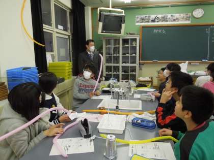 授業の体験では,理科の学習を行いました。学習内容は,「静電気」ということで,どうして静電気が起こるのかということや,静電気の性質について学習を行いました。最後には,静電気をためて放電する実験をしたり,壁に風船を静電気で引っ付けたりしました。