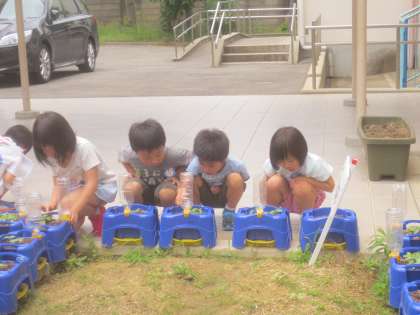 自分のあさがおをみて,お水をあげて,そして「がんばって大きくなってね。」「お水をあげるからね。」と話しかけていました。