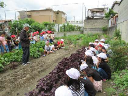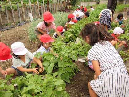 地域の方のご厚意で,ジャガイモを収穫する体験をさせていただきました。子どもたちがいつもお世話になっている地域の先生です。一人一株,ジャガイモを収穫するために畑を掘りました。低学年にとって,肥えたよい畑の土は重く,苦労しながら堀りました。とても楽しい苦労でした。「ジャガイモ出てきた!大きい!」「いっぱい出てきた!」と,次々と出てきたジャガイモに子どもたちは大興奮でした。2年生は,学校で育てているトマトの「脇芽とり」の仕方についても教えてもらいました。