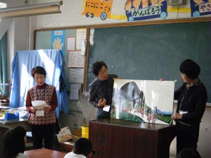 25日、1年生が地域女性会の皆さんに『はなさき山』のお話を読んでもらいました。しっとりとした語り口に、1年生の子どもたちは、聞き入っていました。