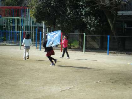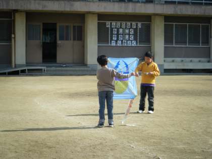 生活科の学習で、2年生がたこづくりをしました。寒い風の中、思い思いのたこを一生懸命とばしていました。