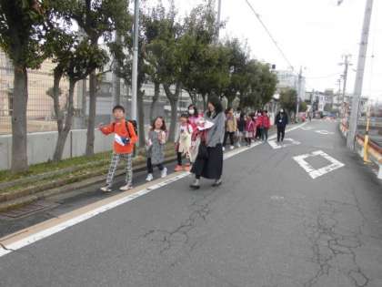 その後、新班長を先頭に集団下校をしました。役割を引き継ぎ,安全に登校できるようにしていきます。