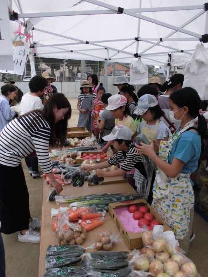 やさい販売コーナーがにぎわいを見せています。エプロン姿の子どもたちが瑞々しい野菜を販売しています。トマトに九条ネギにナスにきゅうり、たまねぎなど,たくさんの野菜を前に買いに来た人も迷っています。積極的に声をかけて販売する姿がたくましく見えました。