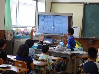 ノートを大型テレビに映したり,黒板に図を描いたりしながら,式の意味をみんなで話し合いました。