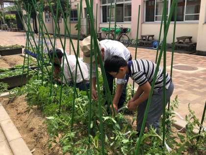トマトが子どもたちの水やりのおかげで随分成長しました。今日は,地位の方に指導していただき,支柱を立てました。
