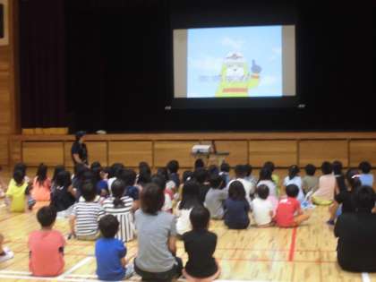 防災の集いがスタートしました。子どもたちも地域の方もたくさん参加しています。災害はいつ来るかわかりません。その防災について学ぶことはとても大切です。小学生にもわかりやすいアニメ上映を通して,学んでいます。