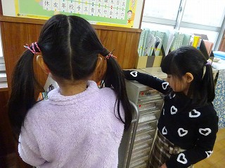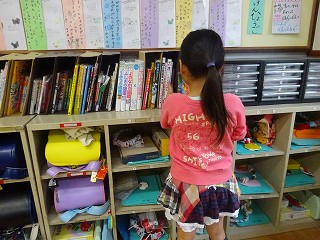 「きれいにしなきゃ〜☆」と,きれいな本棚をさらにきれいにしはじめる1年生!