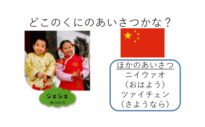 きょうかしょに出ているあいさつは,どこのくにのあいさつなのかな?いろいろなくにのあいさつのことばをおぼえて,あかるいこえでつたえてみましょう。