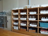 理科室には,顕微鏡・ビーカー・フラスコ・シャーレ・試験管・・・など,理科の実験に使う道具がたくさん並んでいます。理科室のマイケルさんも,みなさんに会いたがっていますよ。