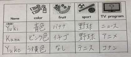 ここは日本語で大丈夫なので,自分や家族の好きな色,好きなくだもの,好きなスポーツ,好きなテレビ番組をインタビューして書いてください。