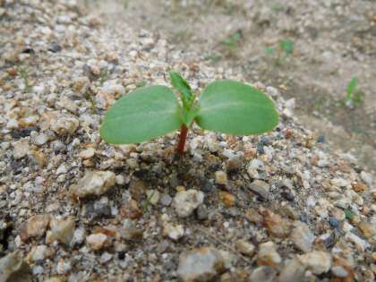 2まい目のしゃしんは「ホウセンカ」のさいしょに出てきた葉っぱです。教科書(p22)にも書いてありますが,子どもの葉と書いて「子葉(しよう)」といいます。高さは1,2cmぐらいでとってもかわいらしいです。