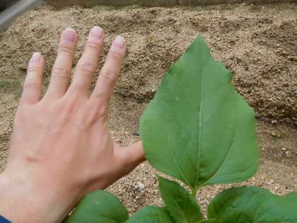 3まい目は,「ヒマワリ」です。ヒマワリの葉っぱはとっても大きくせいちょうしてきて,先生の手の大きさと同じぐらいになってきていました。
