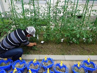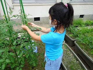 中にわに行ってみると,子どもたちはミニトマトのけんこうかんさつとせわをしていました。すすんでくさぬきをしたり,よこに広がったくきをひもでむすんだり,だれかに言われてではなく,気にかけているすがたはたいへんすてきです。ゆうがた,学校にこられたちいきのはたけの先生からは「じゅんちょうにそだっています」と言っていただきました。