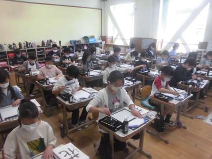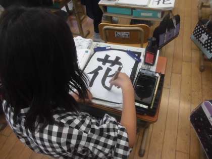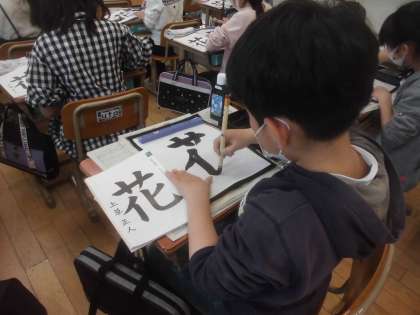 4年生になってから初めての書写の学習をしました。点画の筆使いに気をつけて「花」という字を書きました。「とめ」「はね」「はらい」などを意識しながらていねいに文字を書きました。静かに集中をして取り組む姿はとても素晴らしかったです。