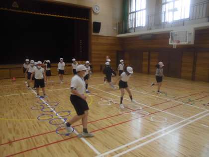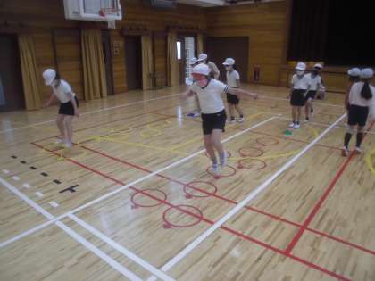 体育科「体ほぐしの運動」では,けんぱをして体をほぐしました。グループの友達と工夫して挑戦してみたいコースを作りながらリズムよく跳んでいました。楽しく運動しながら体も心もほぐしていました。